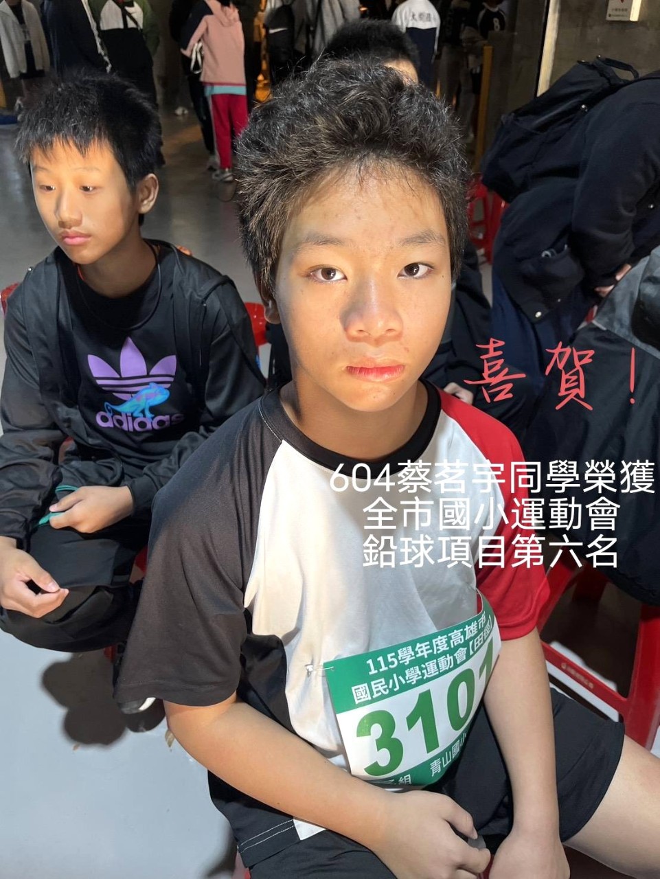 604蔡茗宇榮獲114學年度全市國小聯運男乙組鉛球項目第六名佳績