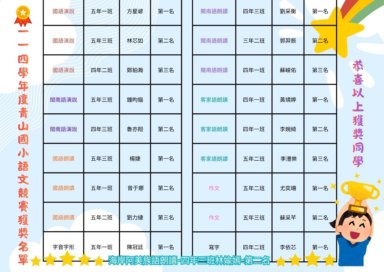 李婉綺、方星嵃、黃于榛、張宸恩、鄭博宬、傅鼎程、邱彥翔、李羿辰組隊榮獲114學年度國民小學英語讀者劇場比賽優等